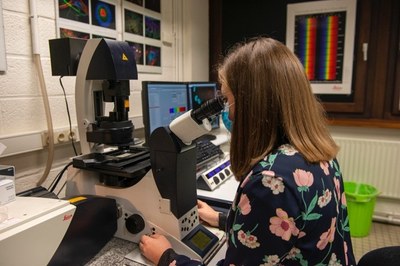 This classical confocal microscope allows multicolor imaging on fixed samples. It allows Z-scanning for 3D reconstructions. Time-lapse imaging is possible on living samples, but only for short periods of time (no incubator, no drift correction system).